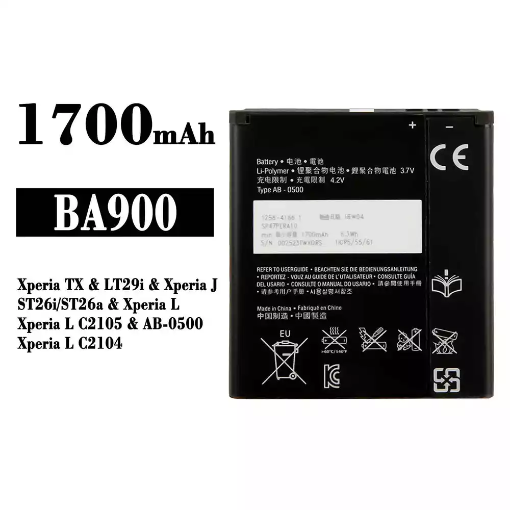 Akun malli BA900 sovittaa Sony Xperia TX / LT29i / Xperia J / ST26i / ST26a / Xperia L / Xperia L C2105 / AB-0500 / Xperia L C2104