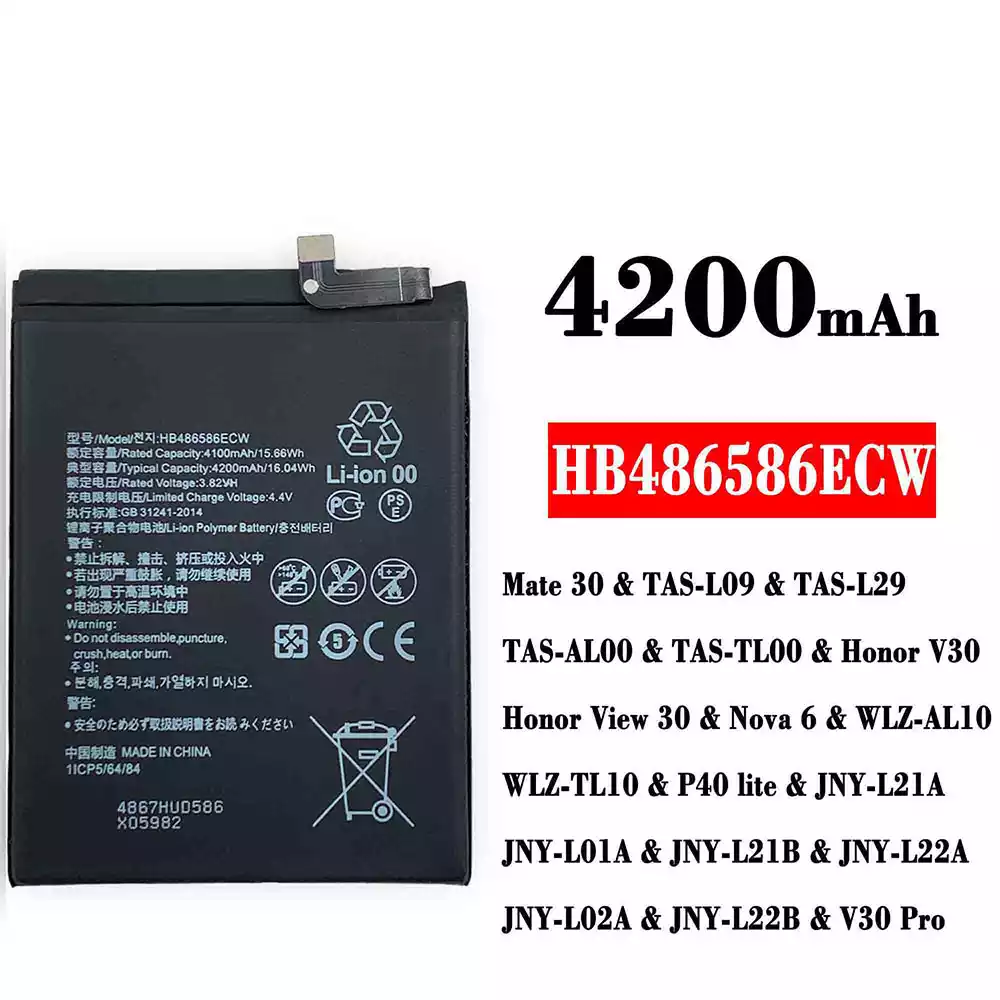 Akun malli HB486586ECW sovittaa HUAWEI Mate 30 / TAS-LO9 / TAS-L29 / TAS-AL00 / TAS-TLO0 / Honor V30 /Honor View 30 / Nova 6 / WLZ-AL10 / WLZ-TL10 / P40 lite / JNY-L21A / JNY-LO1A / JNY-L21B / JNY-L22A / JNY-LO2A / JNY-L22B / V30 Pro